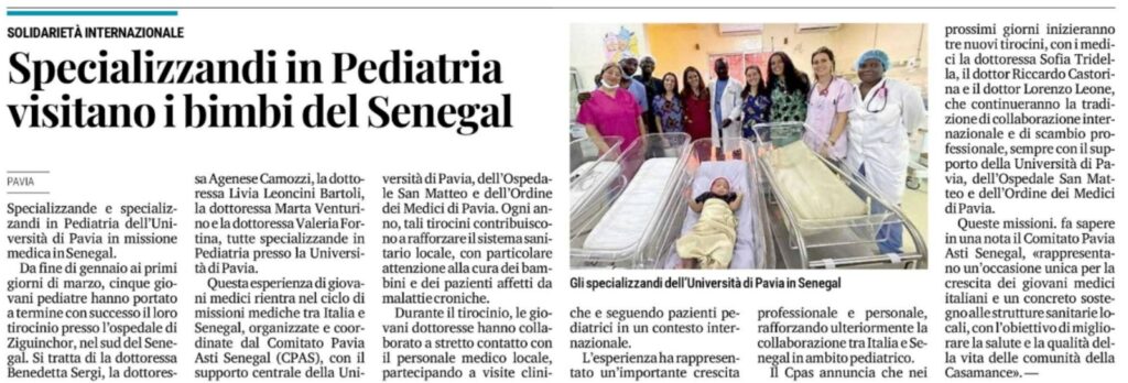 Il CPAS annuncia che nei prossimi giorni inizieranno tre nuovi tirocini, con i medici la dottoressa Sofia Tridella, il dottor Riccardo Castorina e il dottor Lorenzo Leone, che continueranno la tradizione di collaborazione internazionale e di scambio professionale, sempre con il supporto della Università di Pavia, dell’Ospedale San Matteo e dell’Ordine dei Medici di Pavia. Queste missioni rappresentano un’occasione unica per la crescita dei giovani medici italiani e un concreto sostegno alle strutture sanitarie locali, con l’obiettivo di migliorare la salute e la qualità della vita delle comunità della Casamance