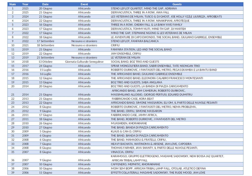 I dettagli e gli archivi dell’evento Africando, dal 2006 al 2025, sono disponibili per la visualizzazione e il download qui.